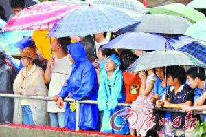 雖然昨天的賽事從頭到尾都在下雨,但這絲毫沒(méi)有影響人們的熱情,記者看到,整個(gè)聚龍村以及河堤的道路兩旁,均停放著大量的車輛,而在河堤上,更是人山人海,人們打著雨傘狂呼,給各自村的隊(duì)伍加油。而在河對(duì)岸的芳村海北村,也與聚龍村的河堤上一樣精彩,隔河相望,相互加油。