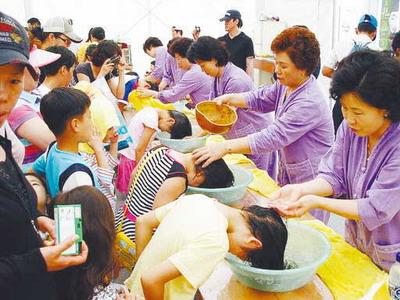 隨后,朋友陪同記者參加慶祝活動,記者看到姑娘們用菖蒲根做成簪子別在頭上,男人們則將菖蒲根纏在腰上。朋友說,這象征可以防止頭痛和災(zāi)厄的發(fā)生。慶;顒又杏泻芏鄡x式,孩子用菖蒲水洗頭發(fā),祈求健康;人們點燃許愿燈,祝愿家人平安。來自農(nóng)村的民俗表演是整個活動中最熱鬧的。小伙子舞動繪有龍圖案和寫有“農(nóng)者天下之大樂”等字樣的大旗,身穿韓服的人們邊敲鼓邊圍成圈跳舞,一些人則裝扮成小丑,穿插在隊伍里,場面很熱鬧,他們用這種形式表達豐收的喜悅。朋友說,端午最有代表性的娛樂活動就是女性聚在一起蕩秋千,男人聚在一起摔跤。端午當天,也有將曬干的艾葉放在大門旁邊以除災(zāi)驅(qū)邪的習俗,韓國人喝菖蒲酒,還將扇子作為禮物贈送,不少商家趁此機會熱賣扇子。