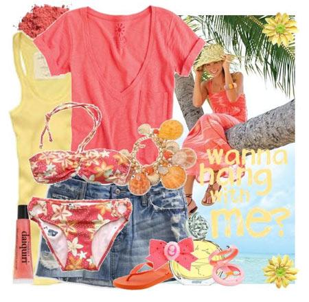 西瓜紅色T恤搭配牛仔裙,海邊風(fēng)情的色彩搭配,T恤里面可以搭上同色系的花朵比基尼。