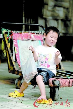 一德路。爸爸前面拉,媽媽后面推,孩子坐在車上吃午飯。