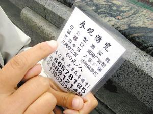 “一日游,60塊錢。馬上就可以走!币幻麐D女湊上來(lái),還揚(yáng)起手中的一張紙片,上面印有參觀行程:白公館、渣滓洞、磁器口或湖廣會(huì)館、環(huán)游半島、人民廣場(chǎng)、三峽奇石館、華巖風(fēng)景區(qū)(含門票、車費(fèi)、導(dǎo)游費(fèi))。