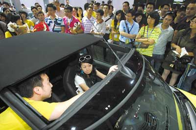 昨日下午3:30左右,寶馬展廳里那輛惹眼的黃色i Cooper前早已人頭攢動(dòng),上百市民駐足此地觀看名車。