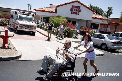 6月17日,在美國亞利桑那州錢德勒的“心臟病燒烤”餐廳,女服務員用輪椅推著用餐后的食客離開。新華社/路透