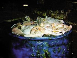 日前,南海當(dāng)?shù)卣鶕?jù)記者提供的線索,執(zhí)法搗毀了多個(gè)死鵝、死鴨加工點(diǎn)。在記者暗訪過(guò)的一個(gè)位于荒地和臭水溝旁的窩點(diǎn),執(zhí)法部門(mén)發(fā)現(xiàn)了堆放在桶里和冰柜里的上百只死家禽,有的已腐爛發(fā)臭。用來(lái)給死家禽脫毛的瀝青不知反復(fù)使用了多久,臭味很重。據(jù)查,每天僅這個(gè)作坊加工、販賣(mài)的問(wèn)題家禽就有四五百只。