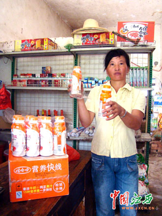 當日上午,記者驅車來到墩上村實地采訪。今年41歲的鄒根枝兒女都在外務工,和丈夫鄒新海兩人在家?guī)腿搜b殼子板,每天120多元的收入讓兩人很是滿足,平時除了吃飯外還特意買些原料補充營養(yǎng)。鄒根枝介紹說:“6月20日,我從墩上村鄒德水的便利店里買來一箱娃哈哈營養(yǎng)快線,當時怕飲料不新鮮,還特意看了生產(chǎn)日期,見是2009年5月31日生產(chǎn)的才放心買了回去,放在家里晚上看電視的時候喝,有些時候我老公(鄒新海)也喝一瓶,但沒有我喝得多。幾天后,我感覺肚子不舒服,上吐下瀉,為此專程搭車到萬年縣石鎮(zhèn)街去買胃藥,花了差不多200元錢病情卻不見好轉,而且肚子痛得特別厲害。沒有辦法,我只好到屋前的墩上衛(wèi)生所去看病,打了幾天吊針以后病情才有所好轉。這次看病不僅花費了近400元醫(yī)藥費,還耽誤了一個多星期沒有干活,就連前兩天插秧都是請人干得,我的損失可大了!