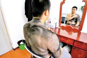 炎熱的夏天,23歲的小宋還穿著長(zhǎng)袖衣服,熱得滿頭大汗!安皇俏也慌聼,我是怕別人看到我身上的黑色‘毛坎肩’,又對(duì)我指指點(diǎn)點(diǎn)!毙∷慰谥械拿布,其實(shí)是已經(jīng)伴隨了他20多年的黑毛胎記。