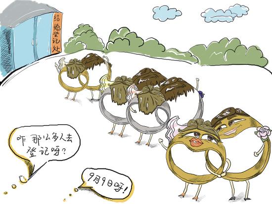 今天是2009年9月9日,成為眾多年輕人喜定終身大事的好日子。不少年輕男女選在今天去登記結婚,有的選在今天大擺喜宴……他們看中的是這個日子里蘊含的百年一遇的“久久久”好彩頭。民俗專家解釋說,2009年9月9日,因諧音讀起來像“愛你久久久”,吸引了許多年輕人選擇在今天喜結良緣,祈求婚姻長久。這一現(xiàn)象源于古人對數(shù)字的崇拜,現(xiàn)在人們利用漢字之間的諧音,以祈福表達良好祝福。