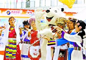 西部美女與吉祥物嬉戲,“2009魅力中華暢冬游”正式開(kāi)幕。記者張偉清攝