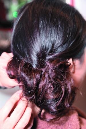 Step2將兩側(cè)的頭發(fā)向外卷曲,將兩側(cè)頭發(fā)向后扭,夾在馬尾之上,用發(fā)夾固定。