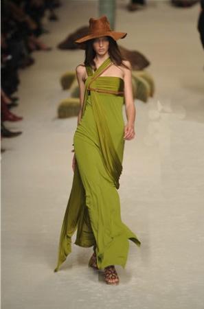 Hermes以面料的質(zhì)感和些微色度的差別豐富了視覺的層次,特別的是胸前扣搭的斜肩皮帶,加上牛仔帽的點綴,不難看出設計師對西部靈感的堅持。