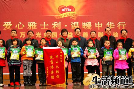 “愛心雅士利 溫暖中華行”千萬陽光工程全國公益捐贈活動,由國務(wù)院扶貧辦、中國扶貧開發(fā)協(xié)會、《中國扶貧》雜志社及中華慈善國際互聯(lián)網(wǎng)救助中心主辦,廣東雅士利集團股份有限公司承辦,全國各省、市、自治區(qū)、直轄市公益慈善機構(gòu)共同參與。遠赴重慶潼南縣的他們,為這里的孩子帶來他們需要的奶粉、學(xué)習(xí)用品等,用這些點滴愛心,伴隨他們健康成長。重慶電視臺、《重慶日報》、《重慶晨報》、《重慶商報》、《重慶時報》、潼南電視臺、《潼南報》等媒體記者也到場進行采訪報道。