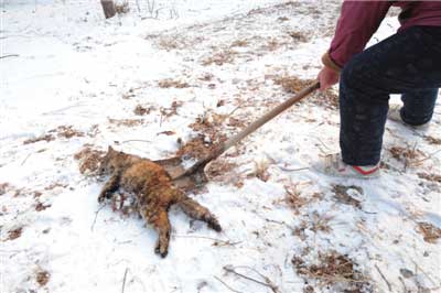 昨天清晨5點(diǎn)多,王阿姨在公園里又發(fā)現(xiàn)了一只被虐殺的流浪貓。王阿姨邊哭邊說(shuō),“前天傍晚我剛喂過(guò)它,沒(méi)想到今天就被人打死了!边@只被虐殺的流浪貓被王阿姨親切地叫做“小灰灰”,它兀自躺在公園東門附近的一處雪地上,腹部被殘忍地剖開,內(nèi)臟和肚腸依稀可見(jiàn),毛上的血液早已凝固,但它的眼睛卻瞪得大大的。