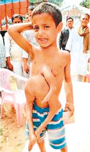 據(jù)德國(guó)《圖片報(bào)》2月19日?qǐng)?bào)道,現(xiàn)年8歲的迪帕克·庫(kù)馬爾是一名來(lái)自印度比哈爾邦的小男孩。從一出生,他的外貌就把周圍的人驚得目瞪口呆:他長(zhǎng)著4條腿和3支手臂,在他腹中有個(gè)孿生弟弟和他一起來(lái)到這個(gè)世界上。