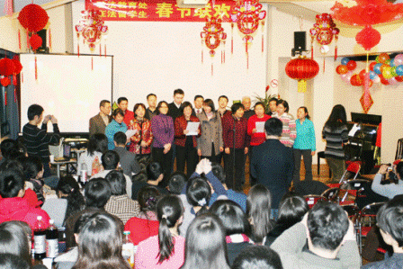 年夜飯后,教育處的老師與留學生們又組織了一臺自己的“春晚”。朱公參首先向虎年生人的老師和學生贈送了紀念品,由旅法畫家李中耀設計的法國虎年郵票5連張。朱公參和老師們一起向大家演唱了《我和我的祖國》。作為音樂愛好者的戴天華老師在大家的熱烈要求下,還獻上了獨唱歌曲。學生們也是各顯其能。晚會上還進行了豐富的抽獎活動。虎年就在人們的歌聲、笑聲、歡樂聲中悄然而至了。(黃冠杰)