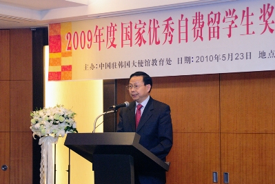 艾宏歌參贊介紹了“國家優(yōu)秀自費(fèi)留學(xué)生獎學(xué)金”設(shè)立的背景和頒獎情況。他說,自2003年實(shí)施以來,總共有1900余名在外優(yōu)秀留學(xué)人員獲獎。2009年度獎勵規(guī)模達(dá)497人,其中在韓自費(fèi)留學(xué)生13人獲獎。他希望同學(xué)們牢記張大使的囑托,奮發(fā)努力,為祖國的建設(shè)和中韓關(guān)系發(fā)展發(fā)揮積極作用!