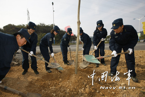 11月6日,東海艦隊(duì)某水警區(qū)20名官兵來(lái)到駐地經(jīng)濟(jì)開(kāi)發(fā)區(qū)開(kāi)展軍民秋季綠化植樹(shù)活動(dòng)。寒風(fēng)中官兵們奮戰(zhàn)半個(gè)多小時(shí),300顆左右的樹(shù)木挺立在荒蕪的土地上,頓時(shí)變得生機(jī)盎然起來(lái)。拍下身上的塵土,大家紛紛表示能在喜迎黨的十八大之際,為建設(shè)第二故鄉(xiāng)貢獻(xiàn)力量,很開(kāi)心。