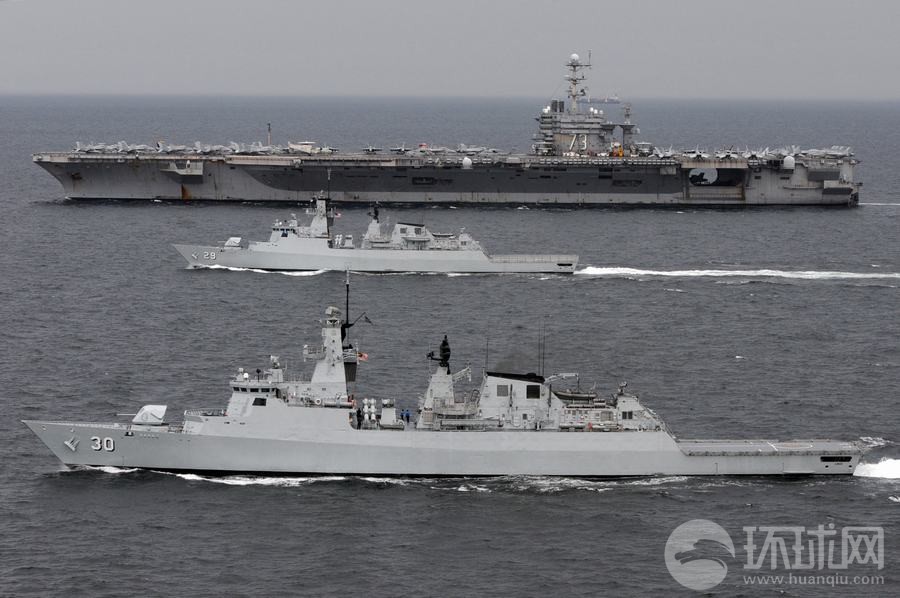 馬來西亞海軍戰(zhàn)艦與美軍華盛頓號航母組成編隊航行