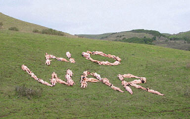 這些為和平呼吁的婦女已經(jīng)擺過七次造型,供媒體進(jìn)行拍攝。她們?cè)?jīng)在一處海灘用裸體拼寫過“和平”一詞;還有一次她們?cè)诩永D醽喼莸囊惶庌r(nóng)場(chǎng)的山坡上拼寫“不要戰(zhàn)爭(zhēng)”的口號(hào)。