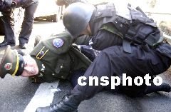 在東四十條橋西側200米處,3輛警車停放在路中間擋住去路,地面上橫著一排道釘。面對荷槍實彈的民警,“劫持者”終于放棄了抵抗,停下車后,依次跳下車來束手就擒。特警們沖上前去,干凈利落的擒拿動作令周圍不明所以的行人誤以為真的發(fā)生了搶劫案。