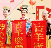 據(jù)臺灣媒體報道,胡志強是7日上午與國民黨另兩位“政治明星”臺北市長馬英九、桃園縣長朱立倫一同在桃園為元宵燈會造勢。朱、馬、胡三人以福、祿、壽三星造型粉墨登場。