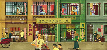 該套郵票描繪六種傳統(tǒng)行業(yè)與民間工藝,包括代寫書信、制造雀籠、縫制旗袍、梳頭美發(fā)、捏面粉公仔及叫賣“飛機欖”。