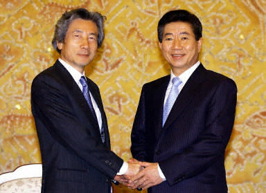 據共同社報道,盧武鉉在宣誓就任韓國總統(tǒng)后在青瓦臺總統(tǒng)府會見了小泉純一郎。