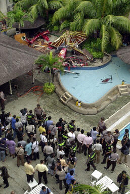 酒店保安監(jiān)督穆哈迪相信﹐該直升機(jī)在21樓停機(jī)坪著陸時(shí)﹐突遇一陣強(qiáng)風(fēng)﹐被吹落樓頂。直升機(jī)墜落在兒童泳池旁邊及三樓平臺(tái)一家露天酒吧﹐部分殘骸散落池中。直升機(jī)支離破碎,但未起火。