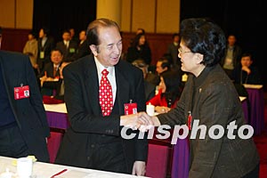 出席全國政協(xié)十屆一次會議的港澳委員七日在北京政協(xié)禮堂舉行聯(lián)組會,中共中央統(tǒng)戰(zhàn)部部長劉延東向出席會議的何鴻燊表示問候。作者:毛建軍