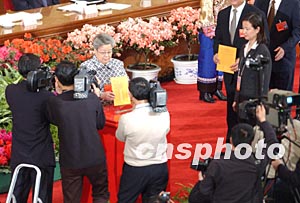 十屆全國人大一次會議第七次全體會議三月十七日在北京人民大會堂舉行,新當選的國務院副總理吳儀參加投票。作者:盛佳鵬