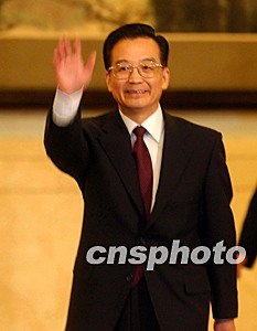 中國新任總理溫家寶三月十八日在北京人民大會堂舉行中外記者招待會,他入場時向云集的新聞界招手致意。作者:賈國榮