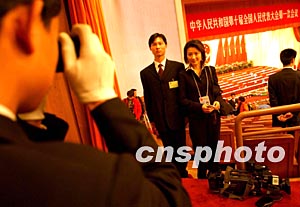 在三月北京舉行的十屆全國(guó)人大一次會(huì)議閉幕前,工作人員與CCTV主持人王小丫合影留念。作者:賈國(guó)榮