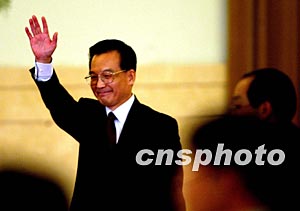 新任國務院總理溫家寶十八日在北京召開記者發(fā)布會,揮手向記者致意。作者:鄭萍萍