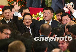 新任國務院總理溫家寶三月十八日舉行新聞發(fā)布會后,向記者們揮手致意。作者:張煒