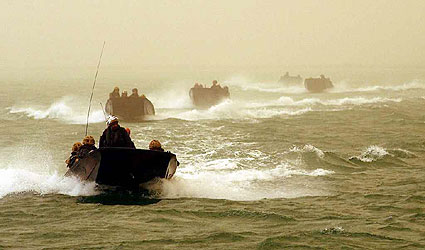 英國(guó)海軍陸戰(zhàn)隊(duì)突擊兵和美國(guó)海軍陸戰(zhàn)隊(duì)員們想重演二戰(zhàn)時(shí)西西里島登陸戰(zhàn)的場(chǎng)面,可伊拉克軍隊(duì)卻不配合:當(dāng)?shù)貢r(shí)間20日晚,科威特北部的美英重炮部隊(duì)、阿拉伯灣北部水域的海軍艦炮、巡航導(dǎo)彈和美國(guó)航母起飛的艦載機(jī)同時(shí)對(duì)伊拉克第二大城市巴士拉的戰(zhàn)略門(mén)戶(hù)――法奧半島進(jìn)行了煞有介事的狂轟濫炸。