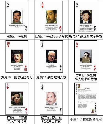中新網(wǎng)4月12日電 據(jù)法新社報(bào)道,美國(guó)國(guó)務(wù)院當(dāng)?shù)貢r(shí)間周五發(fā)出了撲克牌形式的伊拉克高官“通緝令”。媒體報(bào)道稱(chēng)撲克牌共有55張,其中52人為伊拉克官員名單,另外的3張為伊拉克人姓名等相關(guān)問(wèn)題介紹。這些高官按撲克牌的次序依次列出,其中薩達(dá)姆與他的兩個(gè)兒子分別被定為黑桃、梅花和紅心A。方片A為薩達(dá)姆私人秘書(shū)哈穆德。據(jù)悉,撲克牌“通緝令”已經(jīng)發(fā)到美軍官兵手中。