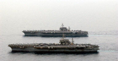 美國(guó)國(guó)防部官員14日說(shuō),美國(guó)海軍的“小鷹號(hào)”和“星座號(hào)”兩個(gè)航空母艦戰(zhàn)斗群已經(jīng)接到命令,將于本周離開(kāi)海灣回到母港。圖為4月13日美國(guó)海軍的“小鷹號(hào)”(前)和“星座號(hào)”兩個(gè)航空母艦在行進(jìn)中。
