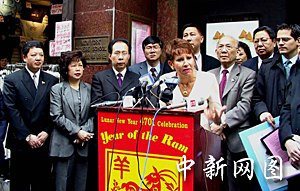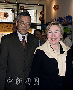 紐約州聯(lián)邦參議員希拉里·克林頓五日到訪紐約華埠,支持華埠抗擊“非典”謠言的行動(dòng)。左為亞美商業(yè)發(fā)展中心總裁王章華。中新社記者 趙海燕 攝