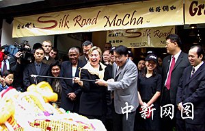 紐約州聯(lián)邦參議員希拉里·克林頓五日到訪紐約華埠,與社區(qū)人士探討振興華埠議題,澄清“非典”謠言,并按照中國(guó)傳統(tǒng)方式為新張的“絲路”咖啡屋剪彩。希拉里右邊為咖啡屋老板蔡政存。中新社記者 趙海燕 攝
