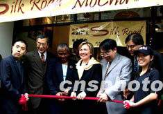 紐約州聯(lián)邦參議員希拉里.·克林頓五日到訪紐約華埠,與社區(qū)人士探討振興華埠議題,澄清“非典”謠言,并按照中國(guó)傳統(tǒng)方式為新張的“絲路”咖啡屋剪彩。(希拉里的右邊為咖啡屋老板蔡政存)中新社記者:趙海燕