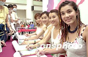 “2003年度香港小姐競(jìng)選”5月10日在香港奧海城商場(chǎng)舉行簽名活動(dòng)。應(yīng)屆港姐冠軍林敏俐(右二)、亞軍左慧琪(右一)、季軍胡家惠(左一)等出席簽名宣傳活動(dòng)。鄧慶樂(lè) 攝