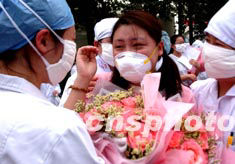 六十名從抗擊“非典”一線凱旋的北京友誼醫(yī)院第一批醫(yī)療隊(duì)十二日回到醫(yī)院,受到全院醫(yī)務(wù)人員英雄般的歡迎。迄今為止,北京友誼醫(yī)院已先后向抗擊“非典”一線派出兩批共計(jì)一百三十多名醫(yī)務(wù)工作者。中新社記者:武仲林