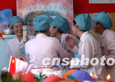 北京友誼醫(yī)院的白衣天使們十二日在院內(nèi)歡度護(hù)士節(jié)。迄今為止,北京友誼醫(yī)院已先后向抗擊“非典”一線派出兩批共計(jì)一百三十多名醫(yī)務(wù)工作者。中新社記者:武仲林