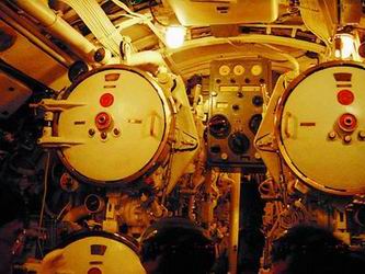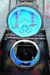 打開潛艇前部的一個艙蓋,只看到舷梯下面一片昏暗。這樣的進出艙口,在潛艇上部共有3個。艙口的直徑也就0.6米到0.7米寬,剛剛夠一個成年人進出。從陽光燦爛的露天走下舷梯,眼前一團漆黑,過了一會兒,漸漸才能看見艙內(nèi)密布的儀表、管道、閥門。原來,為了節(jié)約能源和適應(yīng)水下作業(yè)的壓力,潛艇內(nèi)使用的都是光線昏黃的防爆燈,燈泡的外面還用小拇指寬的鐵條箍住。