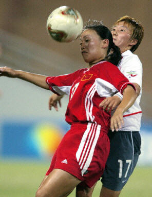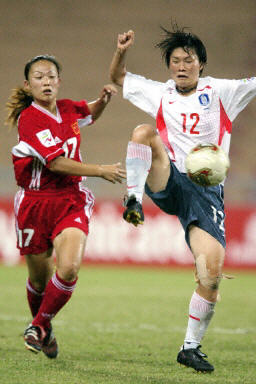 下半場中國依然對韓國隊保持著很大的壓力,并在下半場結束時由孫雯帶球突破后射門得手,將場上比分擴大為三比一。