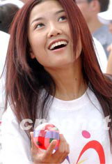 香港歌手黃蓉,2003年6月22日在香港維多利亞公園舉行的“同心攜手畫出彩虹”嘉年華活動上,興高采烈拋彩球祈盼萬事如意。中新社記者 錢興強