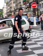 2003年6月的法國巴黎,天氣晴朗,一名警察腳踏排輪穿梭街道巡邏,以快速應(yīng)變狀態(tài)對(duì)付罪案發(fā)生。盧峰 攝