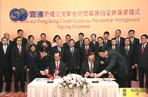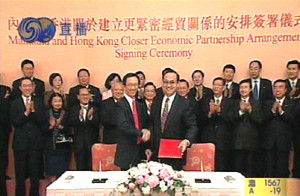 六月十六日,香港特首董建華在正式宣布CEPA月底簽署的消息時(shí)這樣說∶“在國(guó)家主席胡錦濤、總理溫家寶及副總理吳儀的關(guān)心下,香港與內(nèi)地更緊密經(jīng)貿(mào)關(guān)系安排的磋商,已取得重大的實(shí)質(zhì)性進(jìn)展,雙方已經(jīng)極接近一致意見,并商定於六月三十日在香港舉行簽署儀式!