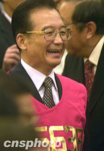溫家寶甫走入會(huì)場,即向在場人士揮手致意,且和很多工作人員握手,還與一些工作人員親切交談,有工作人員要求和溫家寶合影,他也滿足了他們的要求。溫家寶穿上一件編號(hào)“6638”的紅色出市背心,這是一組喻意好運(yùn)的數(shù)字。