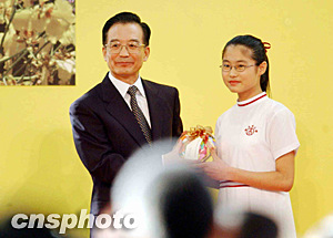 國務(wù)院總理溫家寶6月30日香港表揚(yáng)醫(yī)護(hù)人員成功克服SARS聚會上,接受香港學(xué)生贈送紀(jì)念品。洪少葵 攝