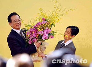 國務(wù)院總理溫家寶6月30日在香港出席表揚(yáng)醫(yī)護(hù)人員成功抗炎大會時,接受醫(yī)護(hù)人員獻(xiàn)花,總理溫家寶隨即將花轉(zhuǎn)送在抗擊SARS中殉職的醫(yī)護(hù)人員家屬時,受到在場人士的陣陣掌聲。洪少葵 攝